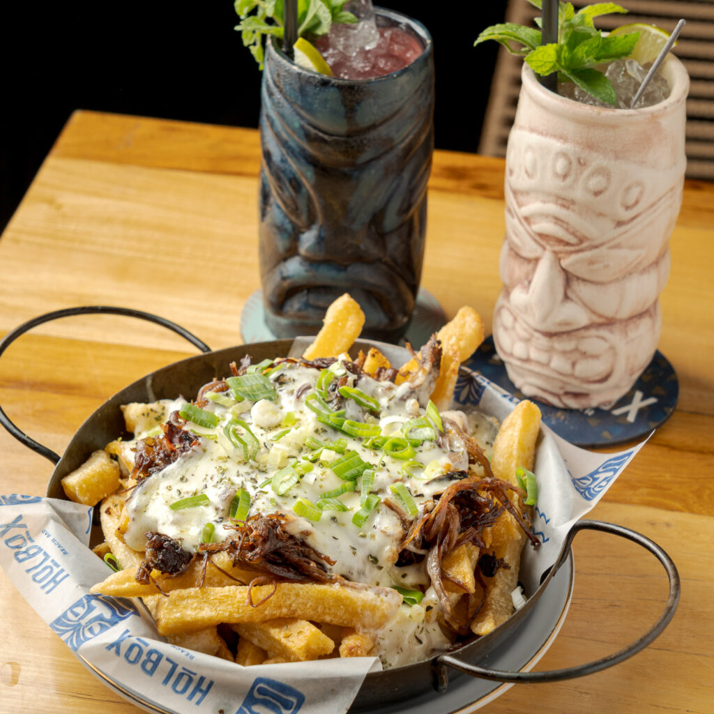 Él elabora un verdadero mapa de sabores donde hay desde sándwiches con carne desmenuzada y hamburguesas de vacío jugosas, hasta tablas de tacos. Entre los sándwiches favoritos de los isleños está «El Mandamás», un sándwich de vacío desmenuzado, y «El Matador», una hamburguesa doble finalizada con el vacío de «El Mandamás». Y, entre los picoteos elegidos están las papas Tiki, la Tabla Holbox y un delicioso picoteo veggie.