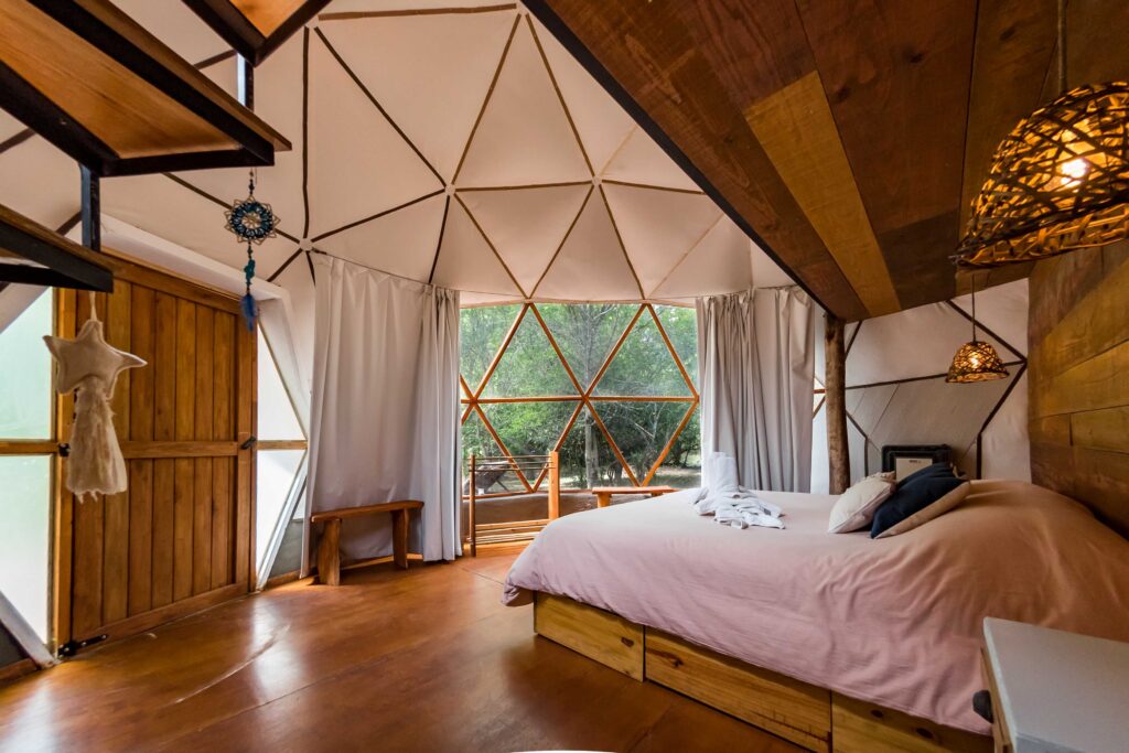 En el interior de los domos los huéspedes disfrutarán de comodidades como: baño privado, cama king size o twin, un acogedor espacio de living, caja de seguridad, frigobar, WiFi y amplios ventanales que brindan luminosidad y vistas únicas del paisaje.