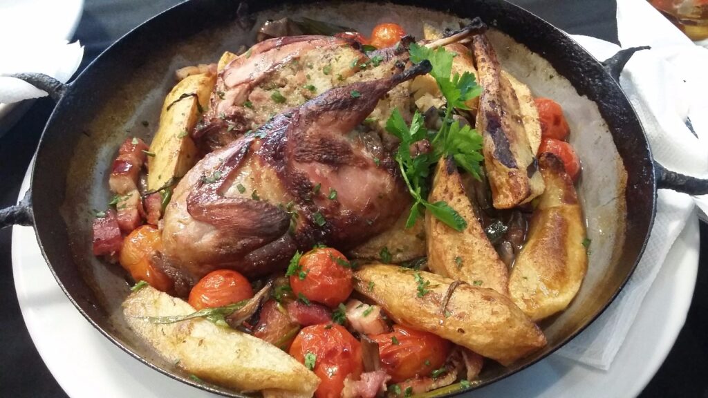 Motivados por las sugerencias y especialidades, optamos por la perdiz rellena con panceta, avellanas y pasas de uva, acompañada por papas al horno con champiñones y tomatitos cherry. La perdiz estaba tierna, el relleno era prudente, no invasivo. Un plato sabroso, rico y abundante.