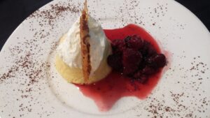 De postre, una Bavaroise de maracuyá con crema y crocante de caramelo, acompañada con frutos rojos. Delicioso.