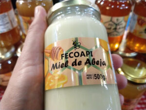 En nuestra recorrida nos llamaron mucho la atención algunas cosas como una miel blanca de Fecoapi (Federación de Cooperativas Apícolas Ltda.), una miel natural que es procesada en estado sólido y que toma un color blanco y una consistencia muy untuosa y con un sabor más suave. La verdad, un hallazgo.