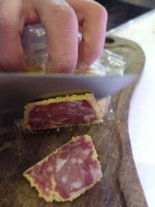 No sólo se destacó por los diferentes puntos de estacionamiento de sus productos sino por una rareza que enamoró. Se llama “pitina” y es como un salame ancho rebozado con polenta, horneado y luego ahumado. ¡Buenísimo! También se lució con un cantimpalo macerado con Cinzano. ¡Hay sangre joven que empuja mucho en Córdoba!