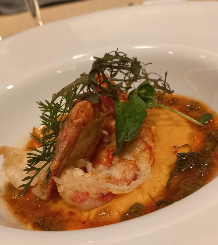 En mi caso, merluza en escabeche, langostinos sobre cremoso de choclo, salmón rosado con pasta de olivas, alcaparras y verduras grilladas. De postre, torta galesa original de Gaiman con helado de crema y reducción de frutos rojos.